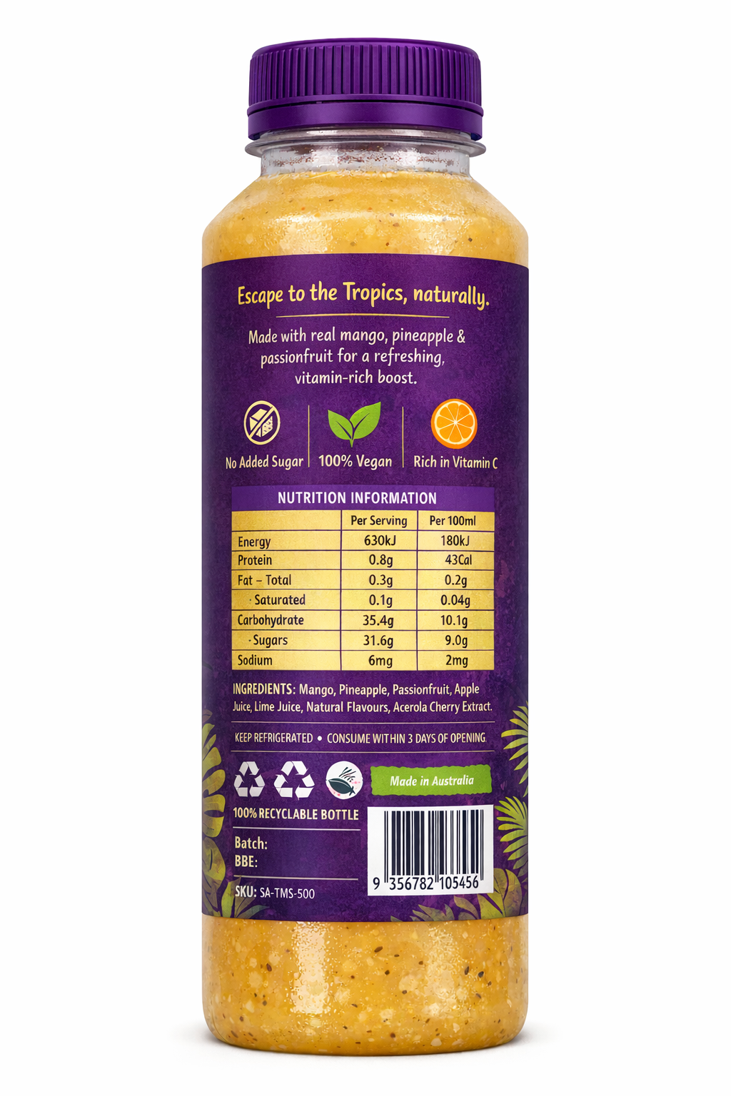 Mango, pineapple, passionfruit, apple juice, lime juice, natural flavours.